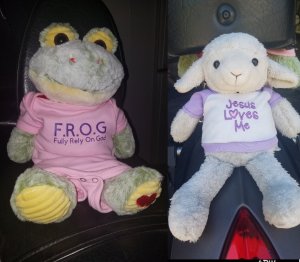 I believe I’ve shared my original riding buddy with you before but I’ve been searching for another for quite some time. I finally found it a few weeks ago, got a onesie for it to wear, and my son’s girlfriend printed my requested acronym on it for me: F.R.O.G